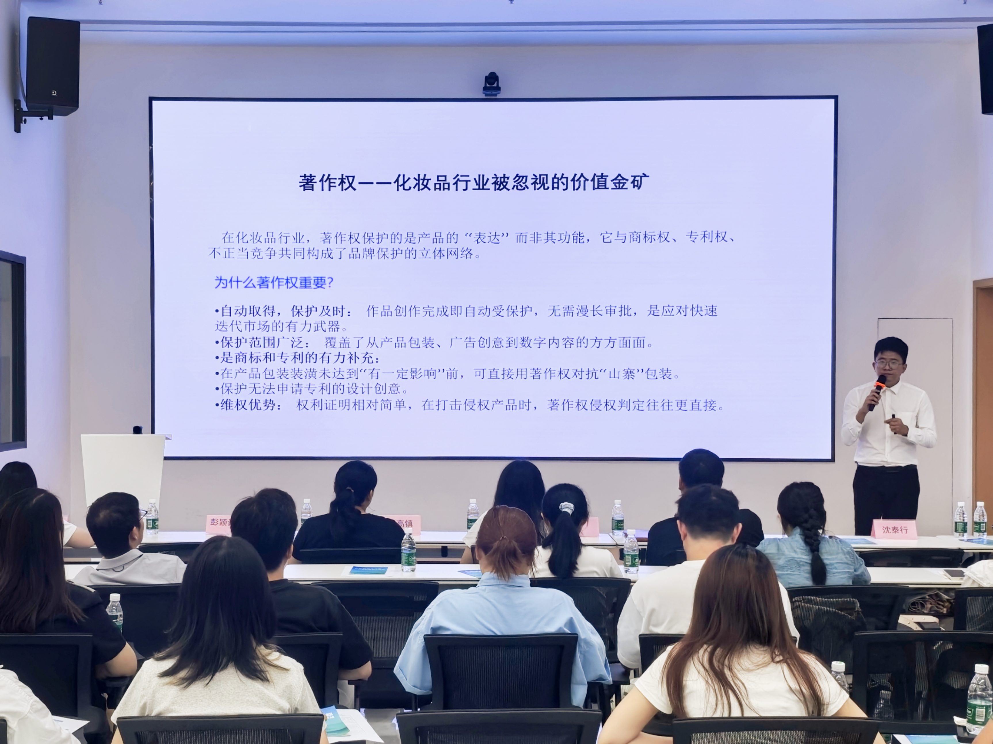 活动特邀法律和艺术领域专家开展精准指导。专职律师沈泰行围绕著作权、商标权、专利权和商业秘密,系统讲解包装设计登记、侵权风险规避与商业秘密保护策略,帮助企业掌握从确权到维权的全流程路径。跨界艺术家陈鹏翔则以“艺术版权驱动美妆品牌‘文化破圈’”为核心,通过与知名化妆品品牌艺术联名礼盒、非遗工艺限定款、珠绣包装等经典案例,探讨企业如何借助艺术版权实现“文化破圈”,提升产品附加值。