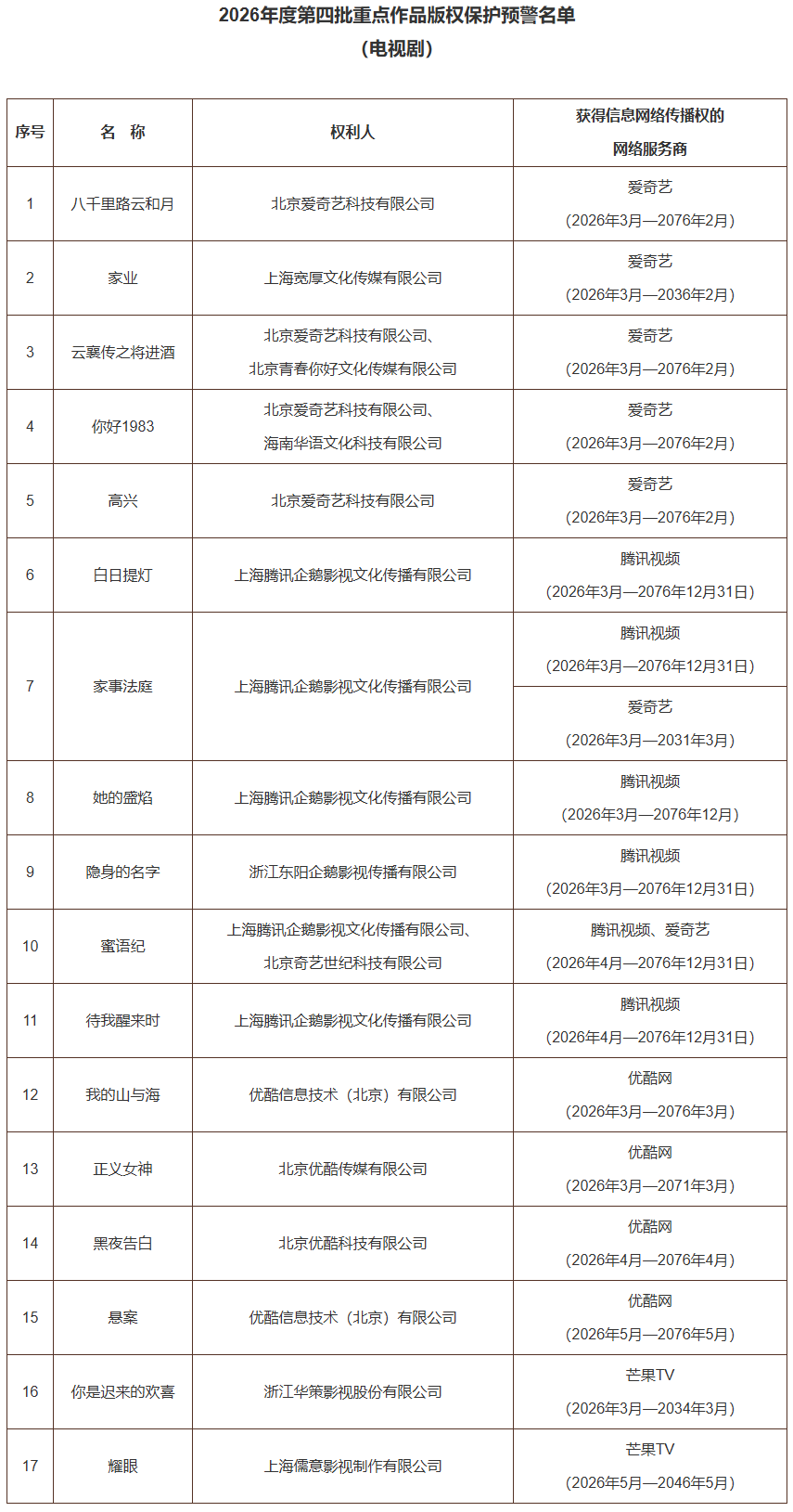 按照国家版权局《关于进一步加强互联网传播作品版权监管工作的意见》及版权重点监管工作计划,根据相关权利人上报的作品授权情况,现公布2026年度第四批重点作品版权保护预警名单(电视剧)。